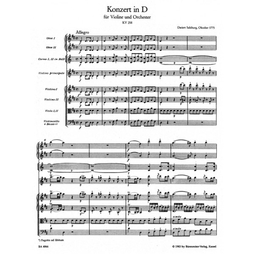 Mozart, W.A. (Mahling): (Score) Concerto in D Major for Violin and Orchestra, No.4, KV 218 urtext (violin, and orchestra) Barenreiter